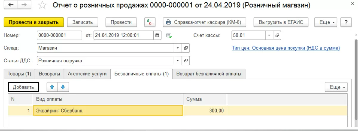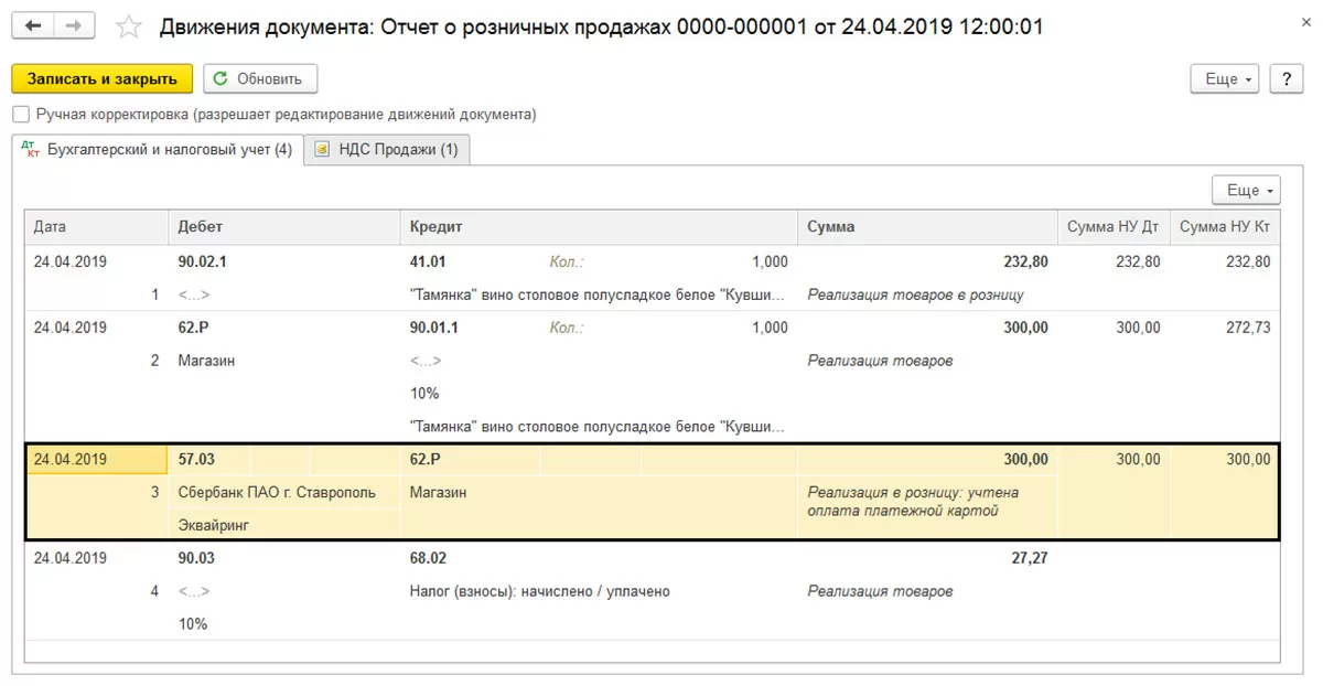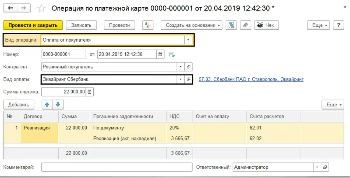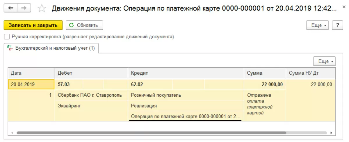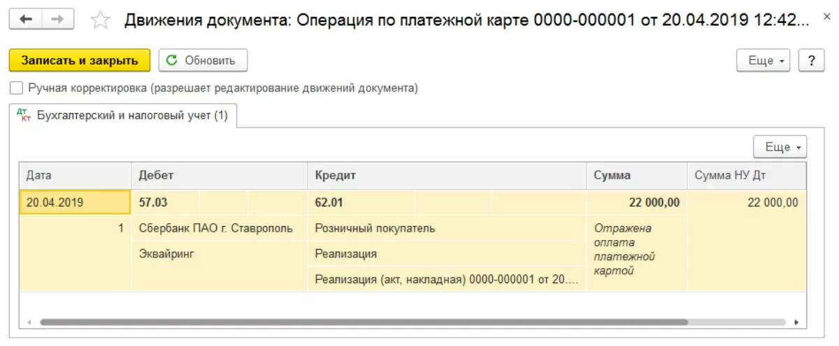Данный документ формирует проводки и по реализации товаров, и по отражению выручки, в том числе полученной путем оплаты платежной картой.