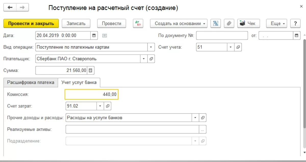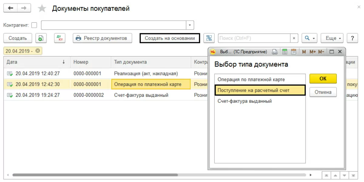 Документ может быть введен на основании из документа «Оплата платежными картами». Выбрав нужный документ, нажимаем кнопку «Создать на основании» и выбираем операцию «Поступление на расчетный счет».