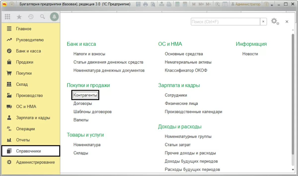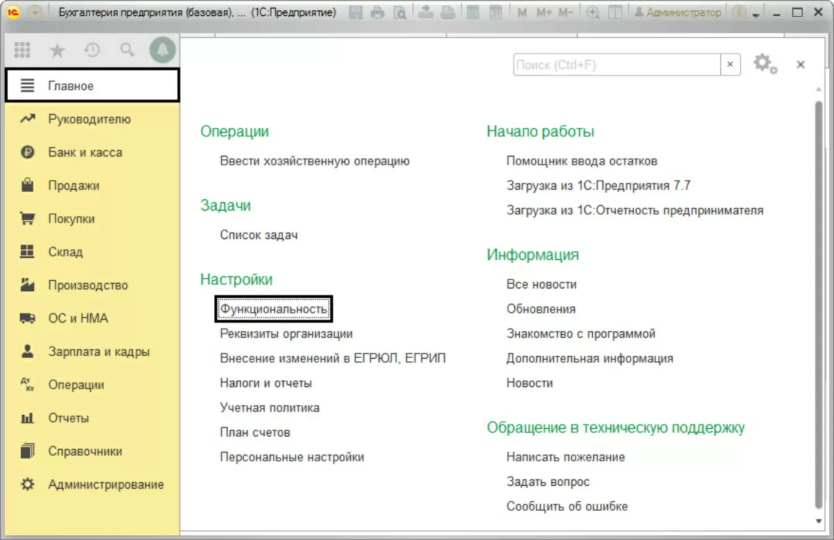 Для отражения в программе данных операций, нужны настройки функциональности программы. Для этого зайдем в «Главное-Настройки-Функциональность».