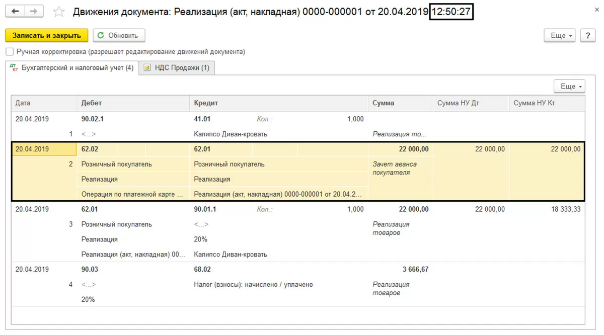 Как мы видим из отчета о движении документа, в этом случае задействован счет 62.02 «Расчеты по авансам полученным». При проведении реализации программа формирует дополнительную проводку по зачету полученного аванса.