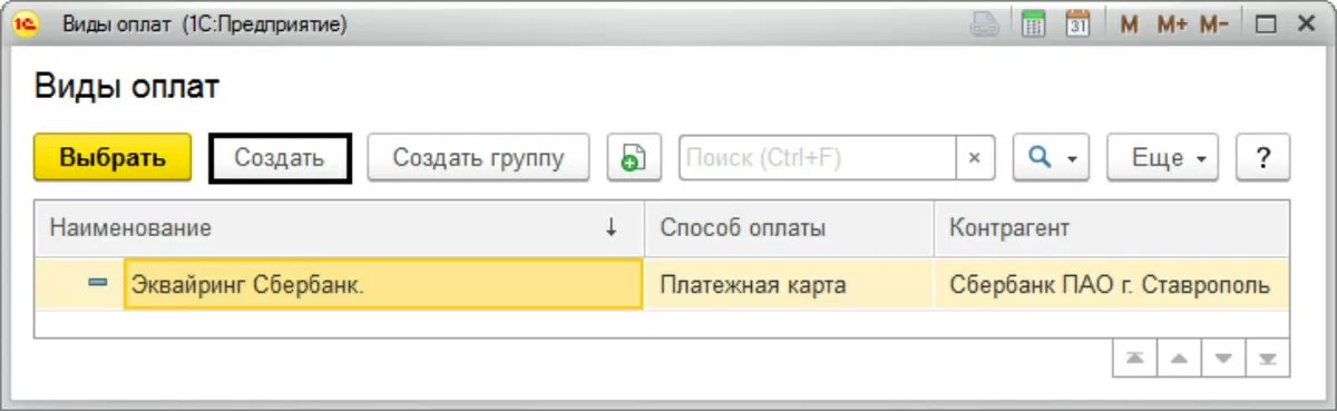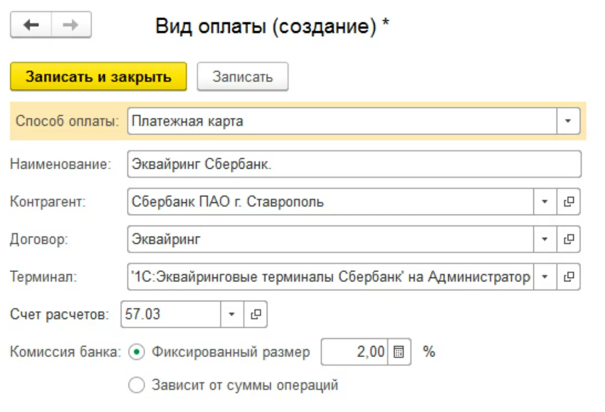 Создадим элемент справочника «Виды оплат» и заполним данные, согласно условиям договора эквайринга. Обратите внимание, на поле, где указывается банковский процент и счет расчетов.