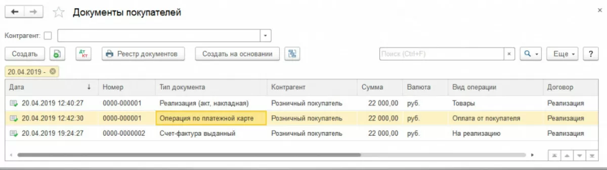 Открыв журнал «Документы покупателей», мы получим доступ ко всем документам этого раздела, в том числе и наш документ «Оплата платежной картой».