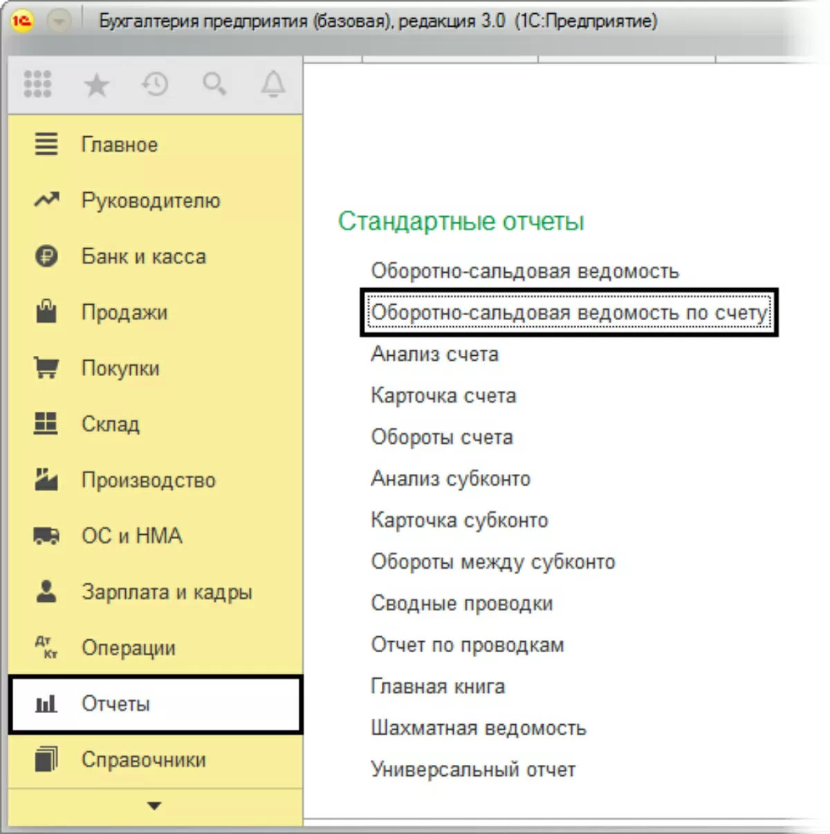 После проведения всех операций бухгалтеру необходимо проверить правильность их отражения, используя оборотно-сальдовую ведомость «Отчеты-Стандартные отчеты».