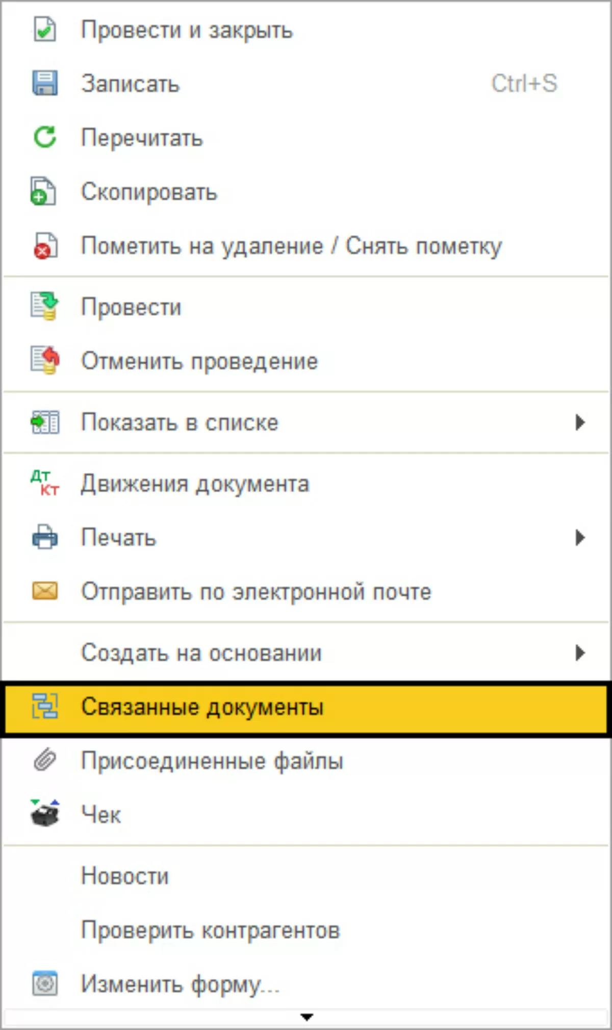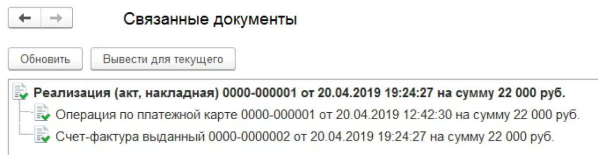 По кнопке «Еще» в нашем документе по реализации мы можем посмотреть связанные с ним другие документы.