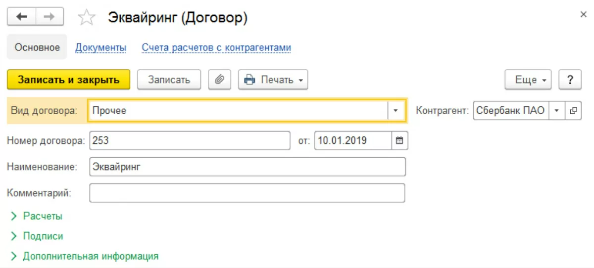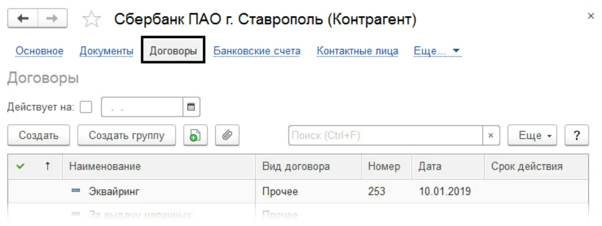 Предварительно нам необходимо занести и настроить договор с банком. Можно это, конечно, сделать и по ходу выполнения операций, но мы рассмотрим этот шаг отдельно. В «Контрагенты-Справочники-Покупки и продажи», в карточке нашего банка занесем данные договора эквайринга.