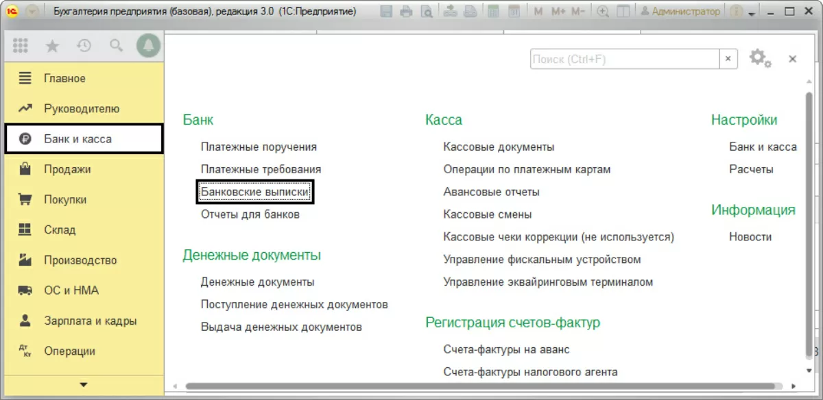 Оплаты от покупателей будут накапливаться на счете 57.03, пока обслуживающий банк их нам не перечислит. Документ зачисления может быть сформирован несколькими способами: при загрузке выписок из клиент-банка, а также самостоятельным вводом в разделе меню «Банк и касса-Банк» банковской выписки.