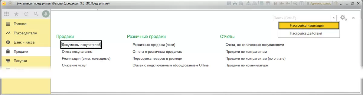 Если вы не видите, где находится ваш сформированный документ – «Операция по платежной карте», то через кнопку настройки, выбрав команду «Настройка навигации», мы можем добавить на рабочий стол любые журналы документов и другие пункты меню, которые не отображены.