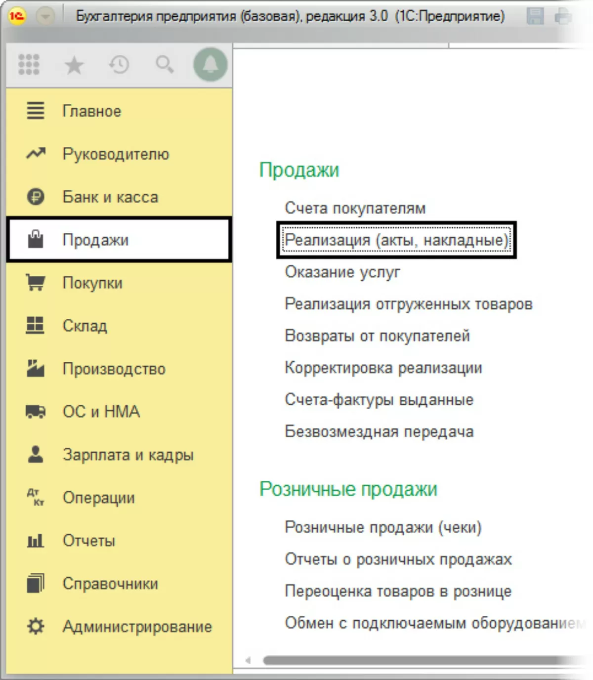 Далее для более полного рассмотрения нашего примера отразим операцию «Реализация (акты, накладные)» в разделе «Продажи».
