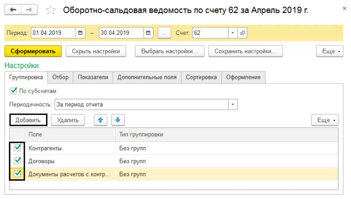 В случае его возникновения, необходимо проверить последовательность проведения документов. При формировании данного отчета, обратите внимание, чтобы в настройке была отмечена детализация по всем субконто – в разрезе контрагентов, договоров, документов расчетов с контрагентами.