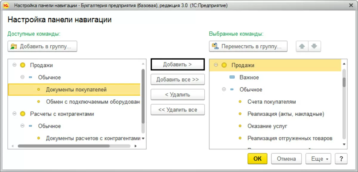 Выбрав нужный пункт, с помощью кнопки «Добавить» перемещаем в правое окно.