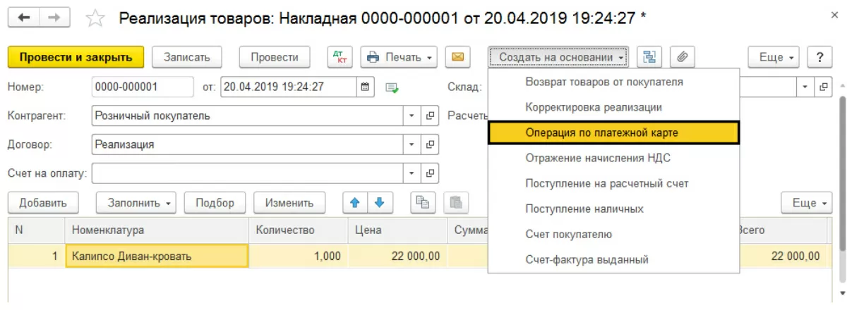 На заполнении документа мы подробно останавливаться не будем, это не должно вызвать затруднений. Перейдем сразу к следующему шагу. Из заполненного документа «Реализация товаров» создадим на основании документ «Операция по платежной карте» - кнопка «Создать на основании».