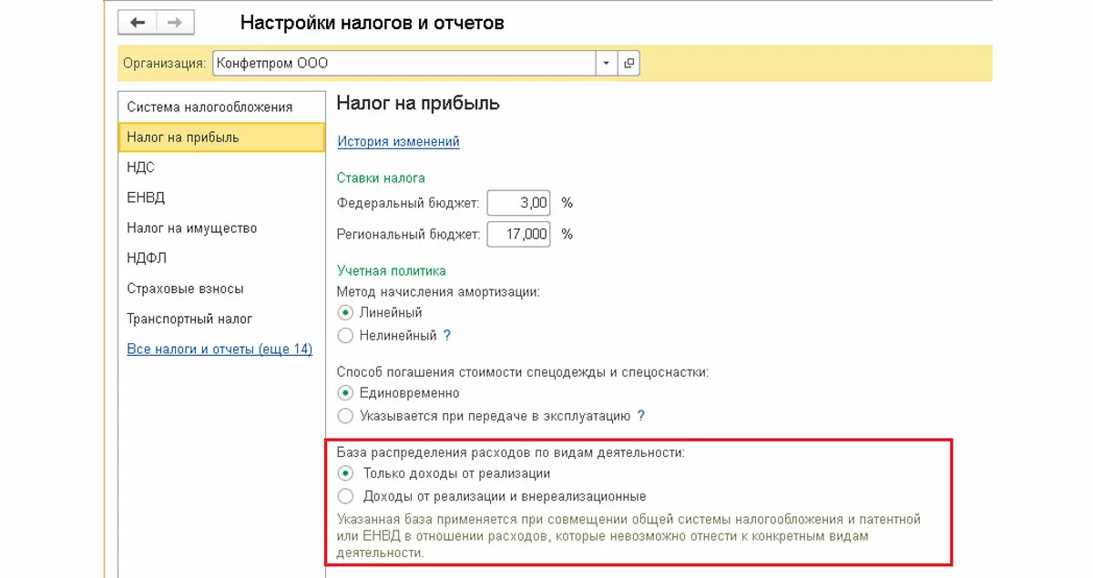 Для расходов, которые невозможно однозначно отнести к конкретным видам деятельности, устанавливается база распределения расходов по видам деятельности. Для этого в форме «Настройка налогов и отчетов», раздел «Налог на прибыль-База распределения доходов по видам деятельности», следует выбрать один из показателей: «Только доходы от реализации» или «Доходы от реализации и внереализационные».