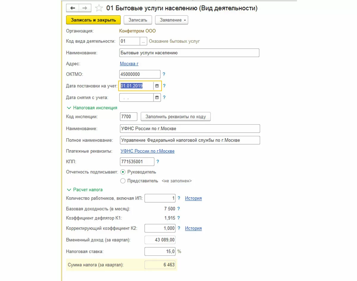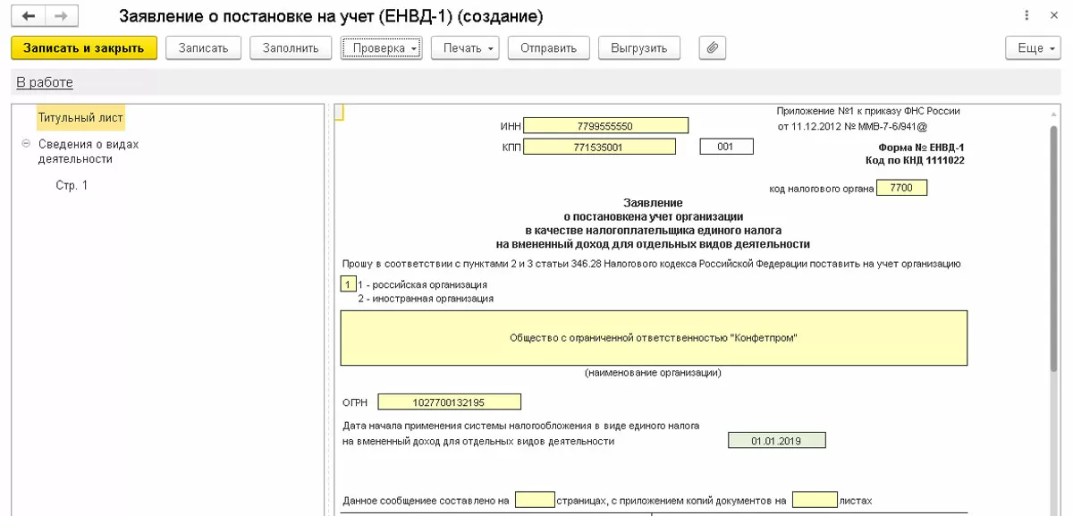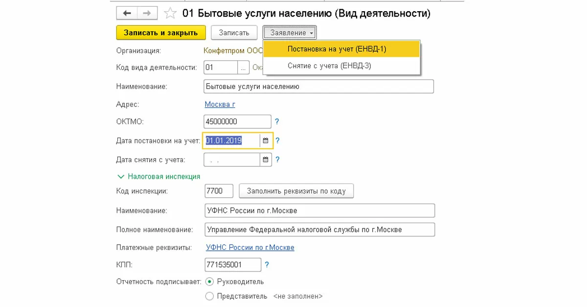 Из этой же формы можно создать заявление о постановке на учет или о снятии с учета. Заявление можно распечатать или сразу отправить в налоговую, если подключен сервис 1С-Отчетность.