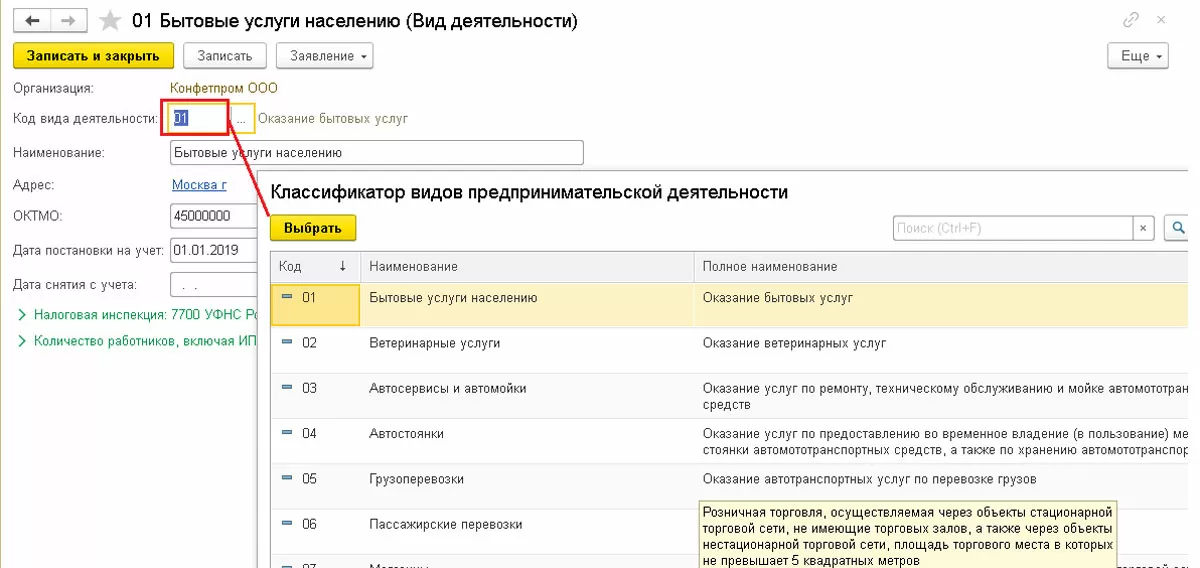 Код вида деятельности нужно выбрать из классификатора.