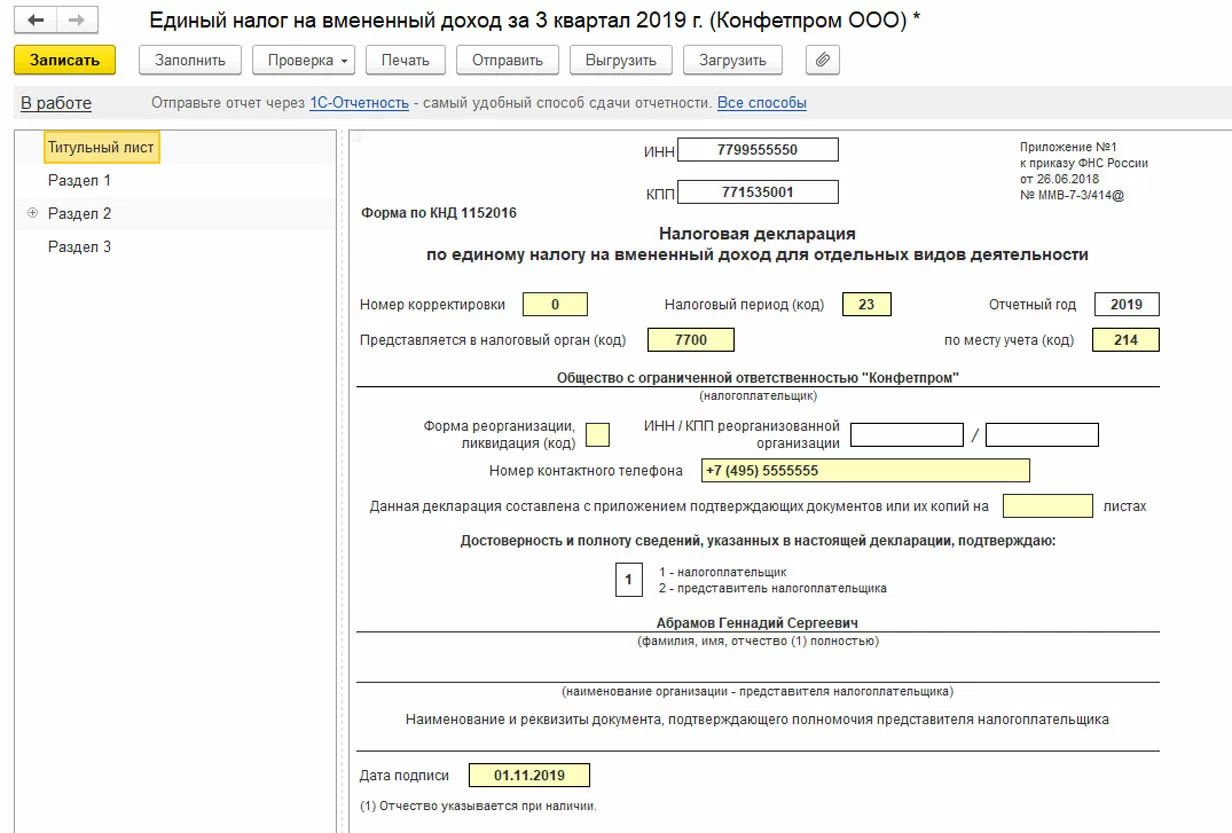 Если в базе подключен сервис «1С-Отчетность», то декларацию можно отправить в налоговую в электронном виде.