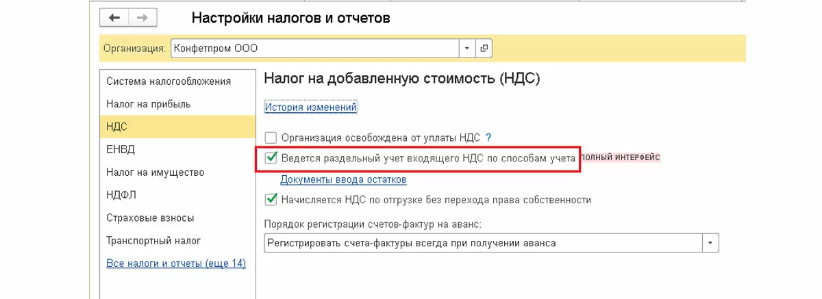 При совмещении деятельности на ОСН и деятельности на ЕНВД у организации возникает обязанность вести раздельный учет НДС, что нужно отметить в форме «Настройка налогов и отчетов» в разделе НДС.