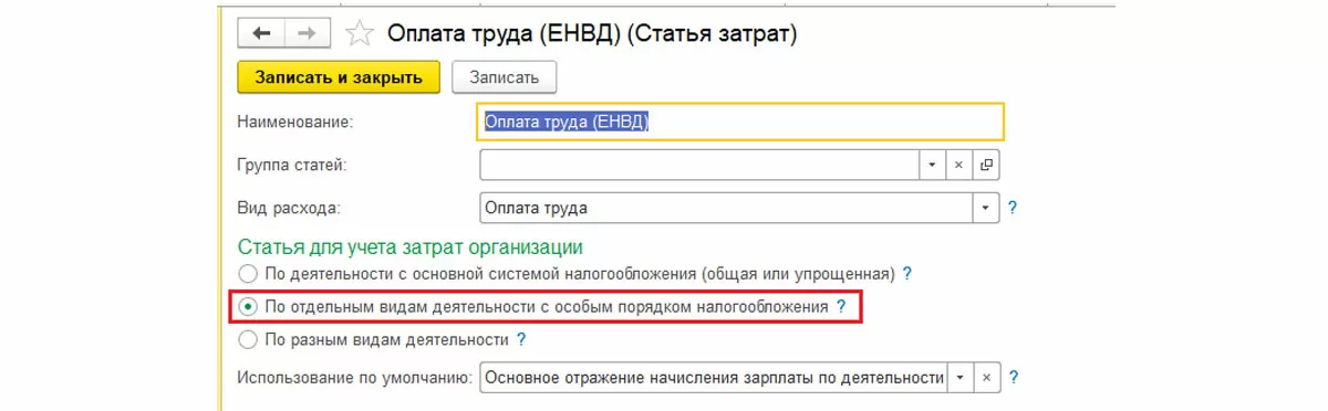 Для настройки статьи под деятельность на ЕНВД добавляем еще одну статью затрат в справочник с настройками, как на рисунке ниже:
