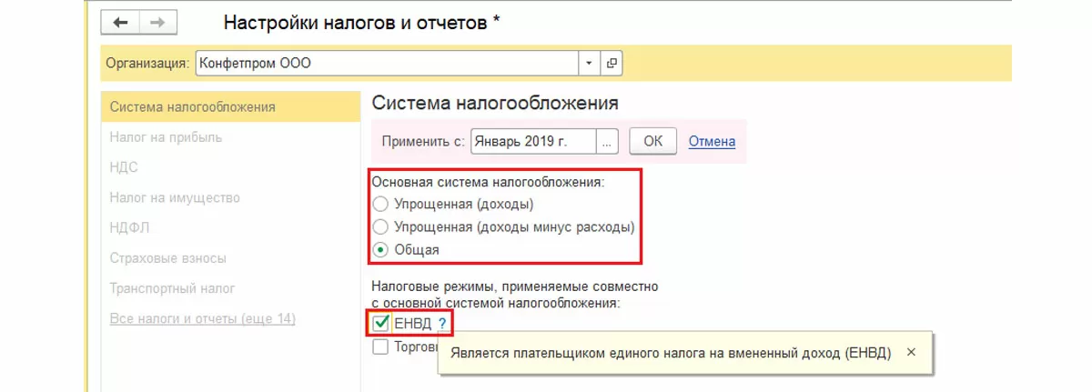 В открывшемся поле указываем организацию и начало применения данной системы налогообложения. Далее выбираем систему налогообложения, используемую помимо ЕНВД – Общая или УСН, и сохраняем изменения по кнопке ОК.