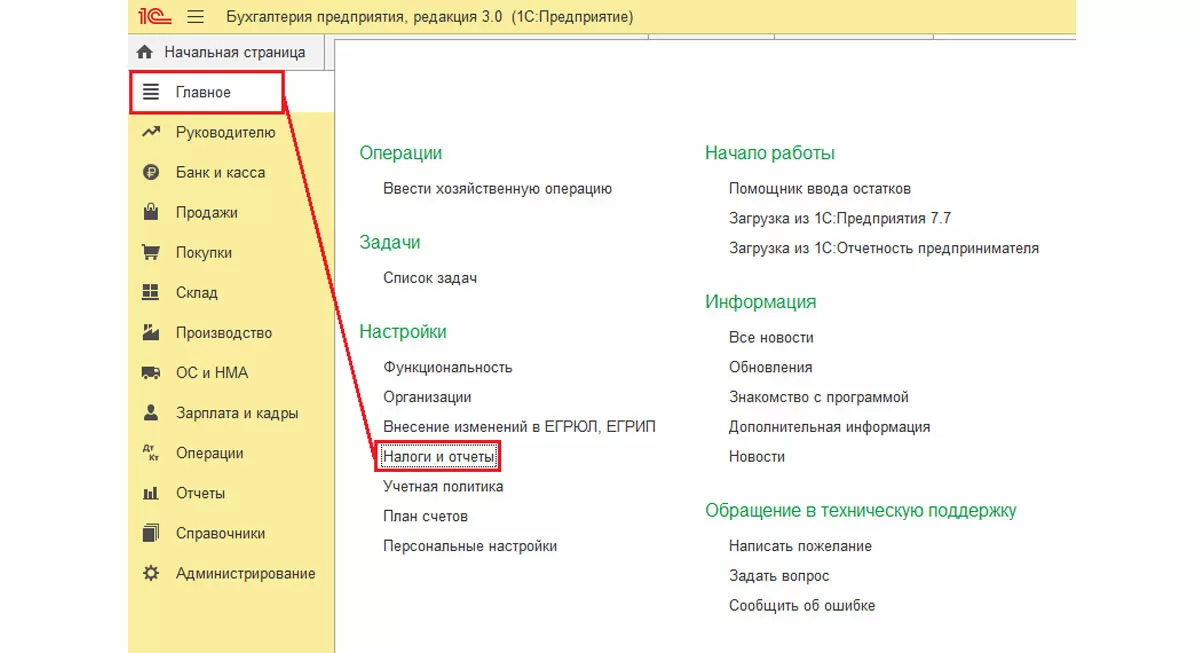 Меню «Главное-Налоги и отчеты».
