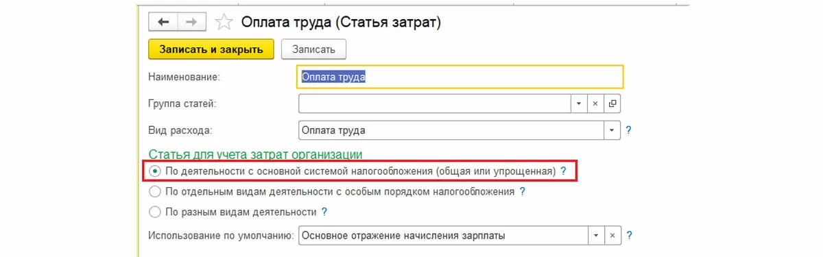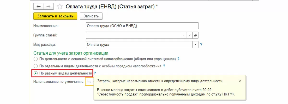 Если статью затрат можно однозначно отнести к деятельности на ОСНО или ЕНВД, то настраивается статья для каждого вида деятельности. Например, статья затрат «Оплата труда». Отнесение затрат на ту или иную деятельность регулируется переключателем в разделе «Статья для учета затрат организации».