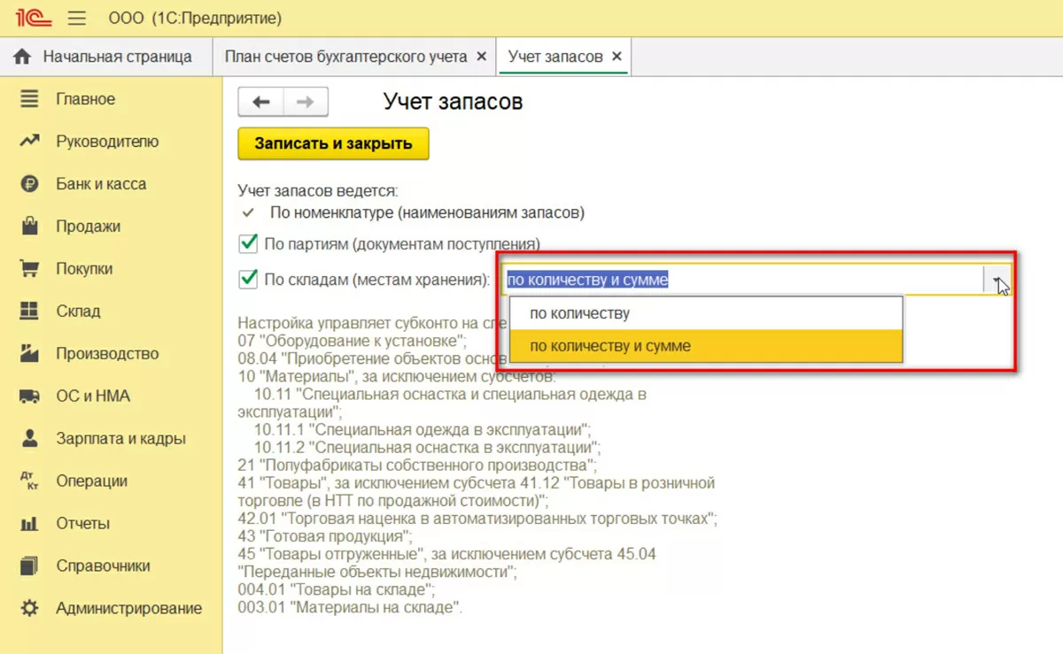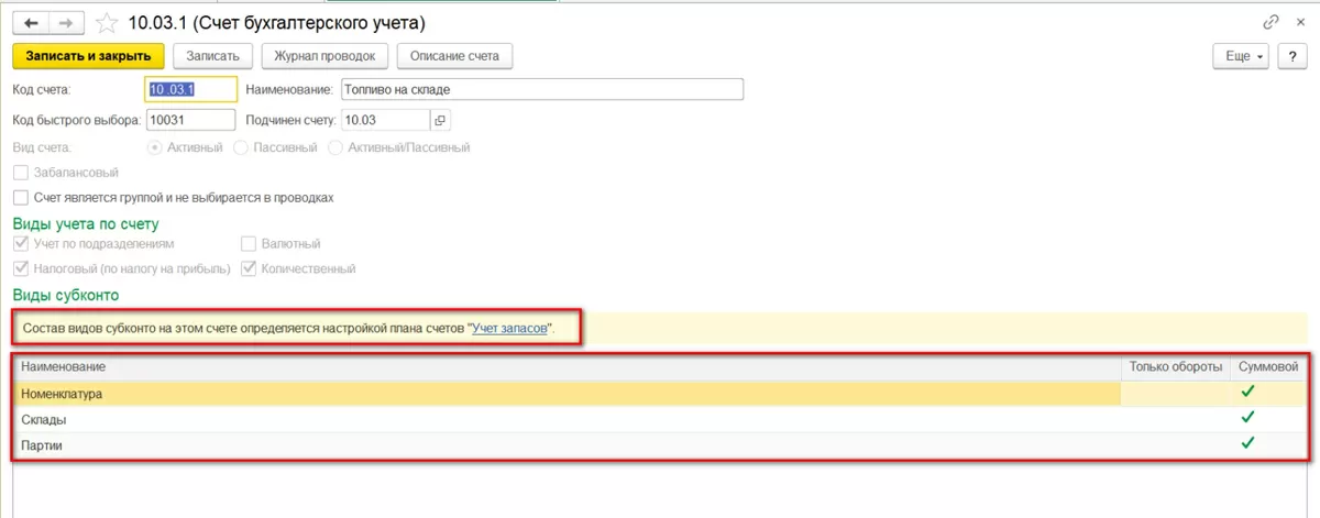 Для того чтобы учет на счете 10.03.1 велся в разрезе складов, посмотрим настройку счета в плане счетов. Откроем счет 10.03.1 – «Топливо». Здесь состав видов субконто определяется настройкой плана счетов «Учет запасов». Установив галочку «Учет запасов ведется по местам хранения», мы получаем дополнительное субконто в виде складов, учет на которых может вестись как в количественном, так и количественно-суммовом выражении.