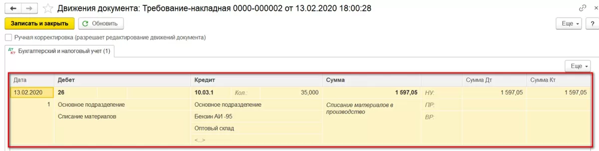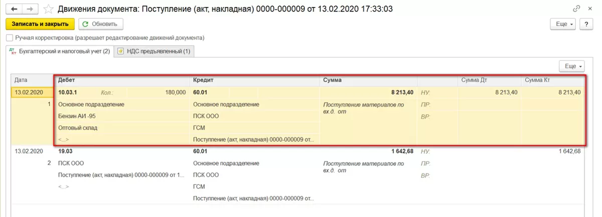 Таким образом, мы оприходовали ГСМ от поставщика. Сформировалась проводка – Дт. 10.3 - Кт. 60.