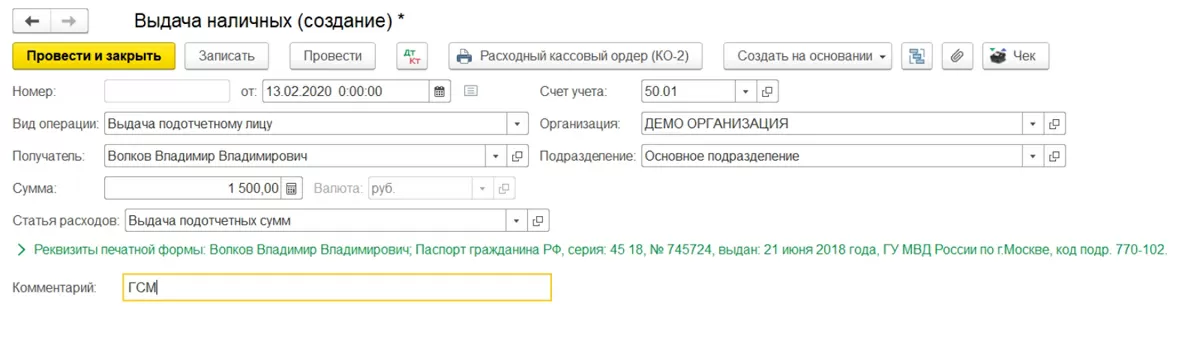 Чтобы отразить самостоятельную покупку водителем бензина за наличность, выданную ему, оформляем авансовый отчет. При этом сначала необходимо оформить выдачу денежных средств подотчетному сотруднику. Выдача денег из кассы фиксируется документом «Выдача наличных» с видом операции «Выдача подотчетному лицу».