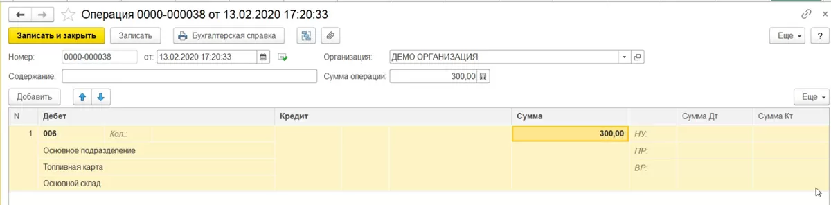 При этом саму топливную карту учитывают как бланк строгой отчетности на забалансовом счете 006 и отражают в учете с помощью ручной операции – меню «Операции» - «Операции, введенные вручную».