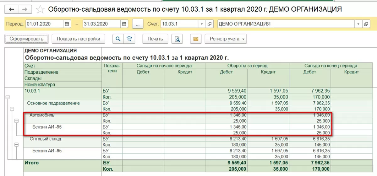 Как видим, в ОСВ выделился условный склад «Автомобиль».