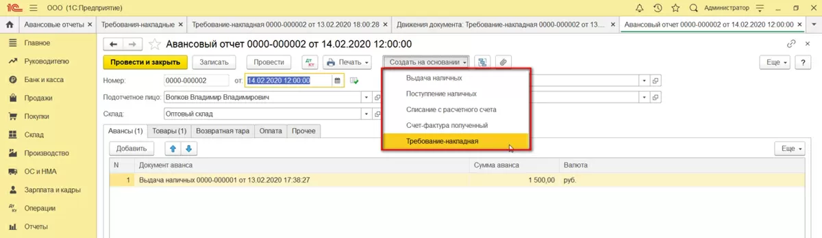Этот же документ также можно сформировать на основании авансового отчета. Для этого, открыв сам отчет или весь журнал «Авансовые отчеты», нажать кнопку «Создать на основании» и выбрать искомый документ.