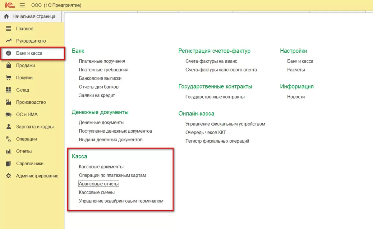 Теперь создадим сам «Авансовый отчет» через «Банк и касса» - «Авансовые отчеты».