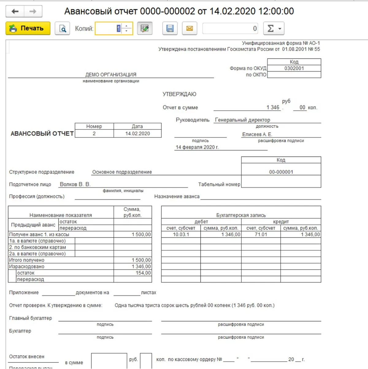 Таким образом, мы оприходовали ГСМ через авансовый отчет. Его проводки – Дт. 10.3 - Кт. 71.01. Нажав кнопку «Печать» получаем печатную форму документа.