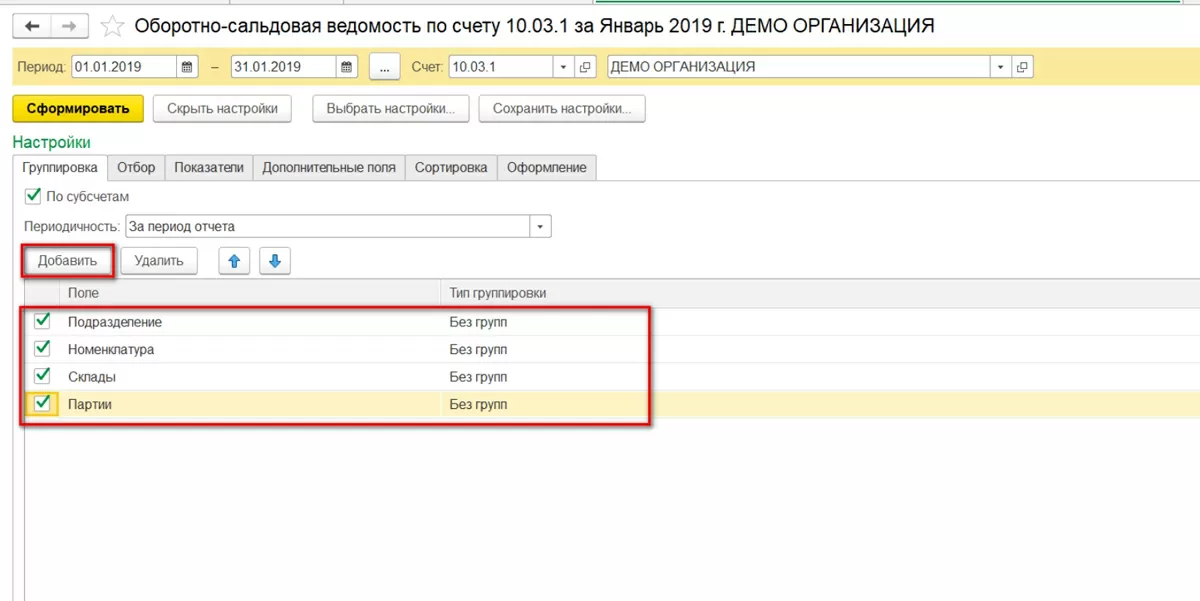 Для примера перепроведем наши созданные документы, изменив «Основной склад» на склад «Автомобиль». После этих изменений в проводках отобразился «Склад», и при формировании оборотно-сальдовой ведомости появилась возможность добавить субконто «Склады».