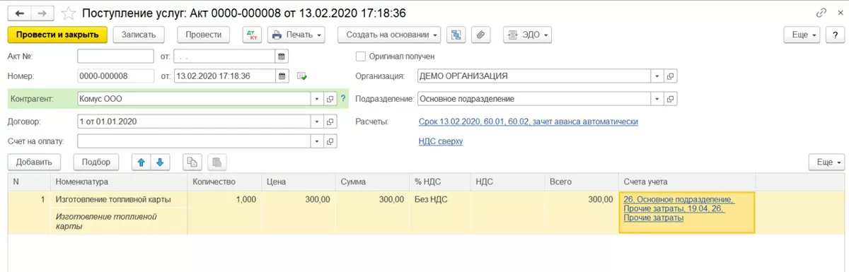 Оприходование стоимости топливной карты (если она есть, так как в большинстве случаев карту используют бесплатно при условии ее возвращения) можно оформить как поступление услуги через меню «Покупки» - «Поступление (акты, накладные)» - создать поступление «Услуги (акт)»).
