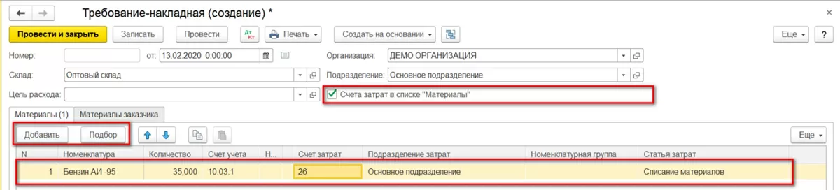 В документе с помощью кнопки «Подбор» или «Добавить» указывается название ГСМ, объем и счет, на который будем его списывать. Последний, в свою очередь зависит от вида деятельности компании: например, если предприятие торговое, то счет списания – 44.01, производство (на основное производство) – 20, а общехозяйственные нужды – счет 26. Установка галочки «Счета затрат на закладке «Материалы», даст возможность указывать счета в одной строке с номенклатурой. Иначе они будут заполняться на отдельной закладке.