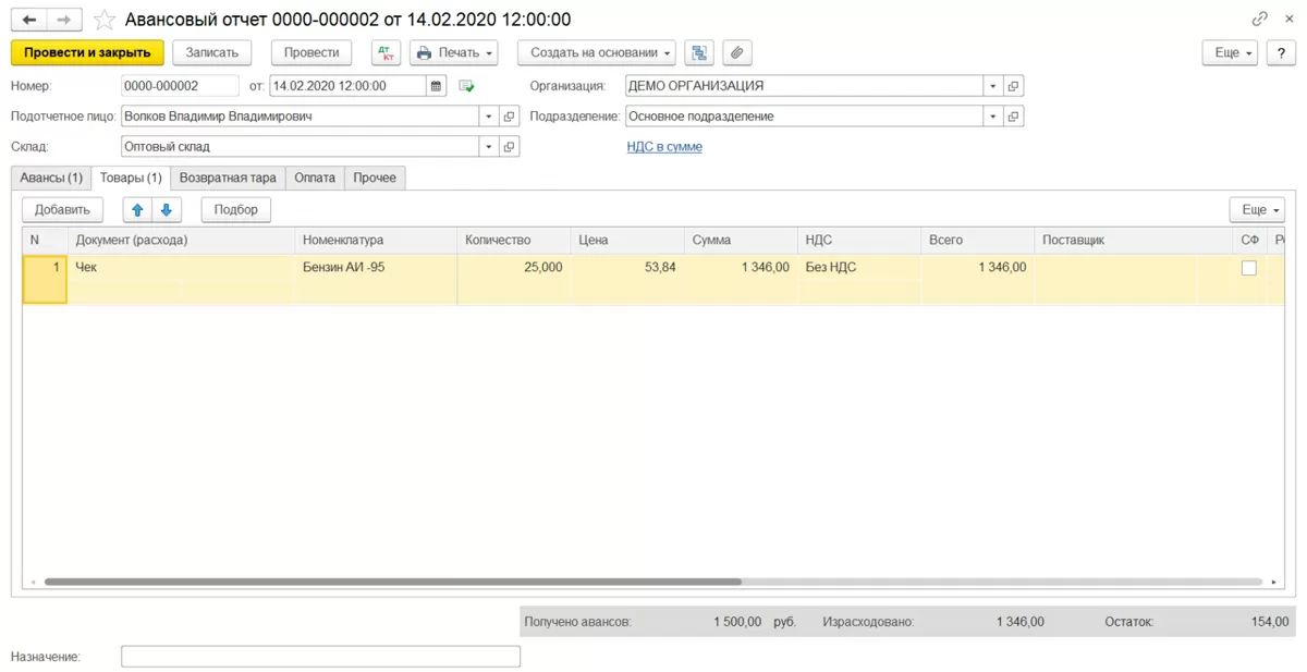 С помощью кнопки «Создать» создаем новый документ, в котором заполняем первую закладку «Авансы»: фиксируем документ выдачи аванса (у нас «Выдача наличных»), а внизу – прикрепленных к отчету документов. Далее переходим к заполнению табличной части, в которой подбираем приобретенную номенклатуру (Бензин Аи-95), указав количество и цену.