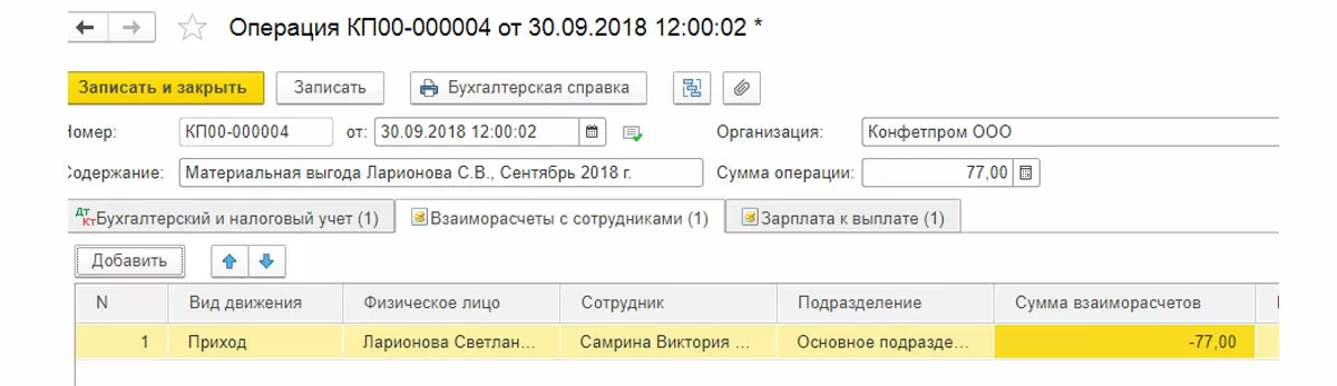 Отмечаем их галочками. В документе «Операция» появилась вкладка «Взаиморасчеты с сотрудниками», ее нужно заполнить.