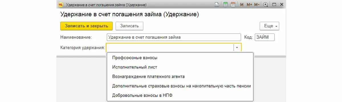 Создаем удержание, заполняем «Наименование»: Удержание в счет погашения займа. А в «Категории удержания» ничего не выбираем, так как из предложенного программой списка нам ничего не подходит. Присваиваем нашему новому удержанию код и закрываем при помощи кнопки «Записать и закрыть».