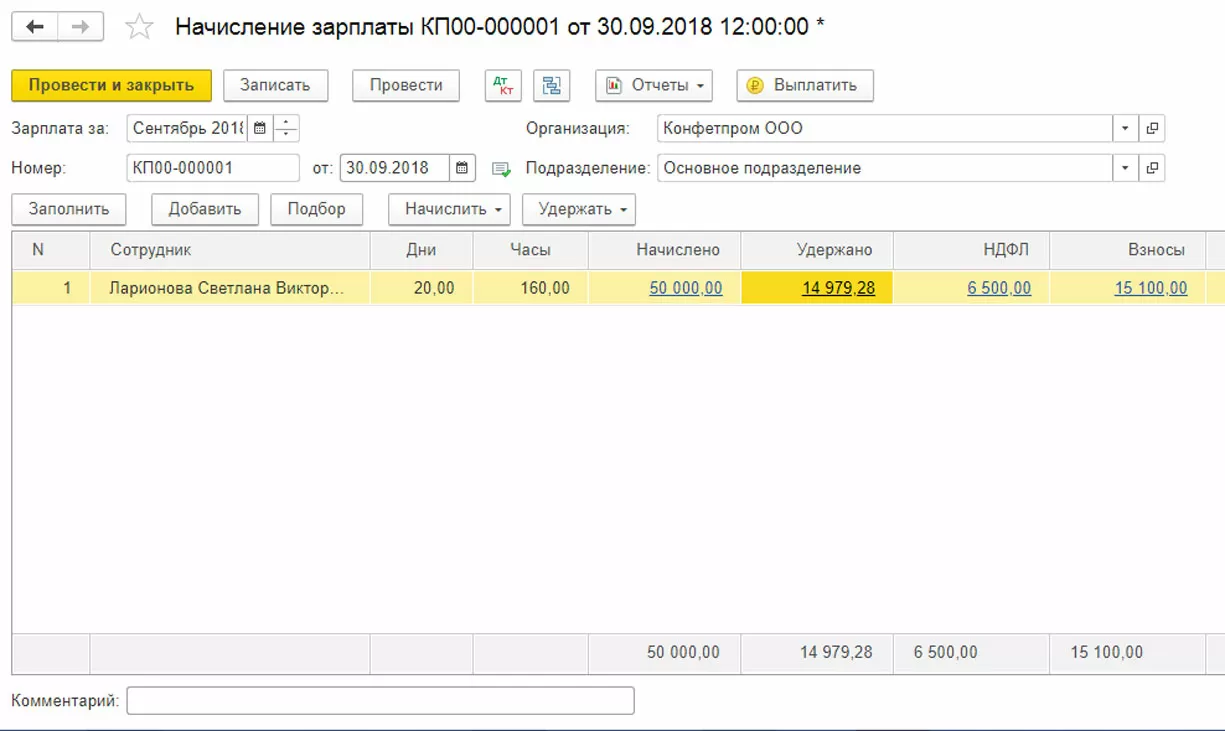 Удержания в нашем документе показываются сводно, для детализации надо нажать на сумму удержаний.