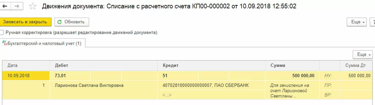 Далее контролируем правильность проводок при помощи кнопки ДтКт. Обращаем внимание, что по дебету используется счет 73.01 Расчеты по предоставленным займам.