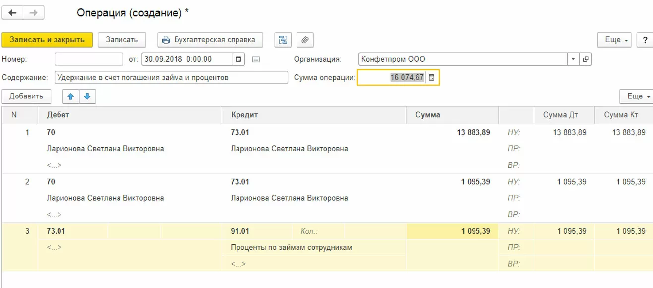 - Дт 70 – Кт 73.01 – отражены удержания из зарплаты сотрудника в счет погашения долга и процентов;