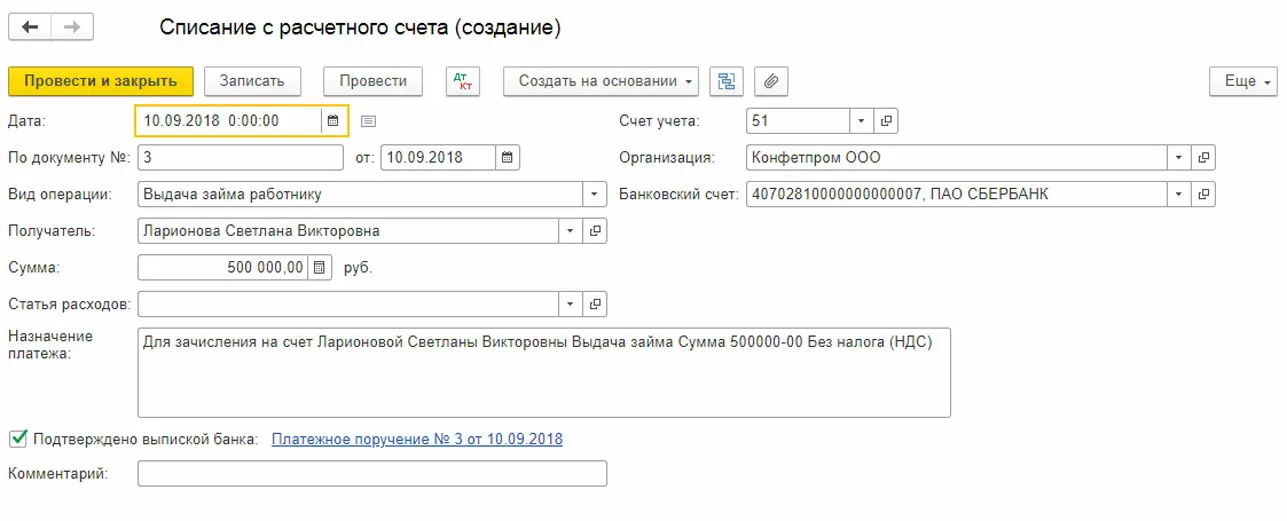 Итак, денежные средства сотруднику по договору займа перечислены.
