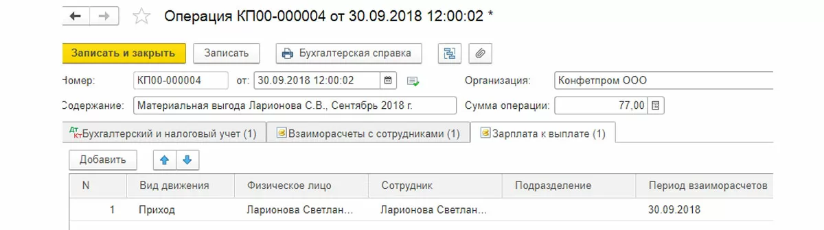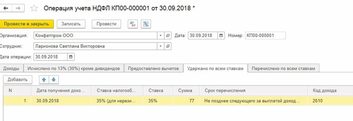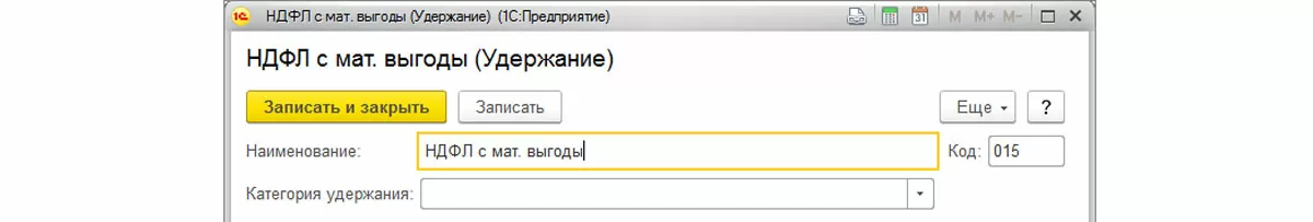 Второй вариант: если НДФЛ с материальной выгоды необходимо удержать при выплате заработной платы сотруднику, то дополнительно можно создать новый вид удержания и отразить его и сумму на закладке «Удержания» документа «Начисление зарплаты». Тогда сумма к выплате за месяц будет рассчитана с учетом налога, исчисленного с материальной выгоды (т. е сотрудник получит меньше на сумму удержания). Все движения по регистрам сделает документ «Начисление зарплаты».
