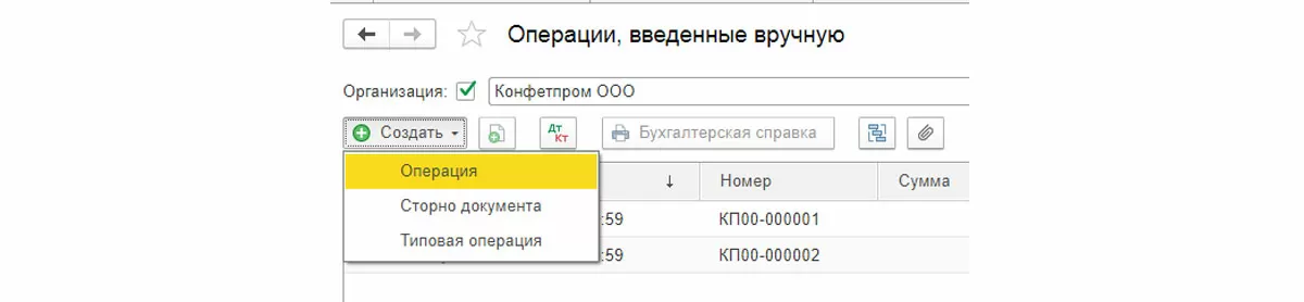 Документ «Начисление зарплаты» не создает проводки по удержанию ежемесячного платежа и процентов по займу, поэтому для отражения в бухгалтерском учете этих сумм необходимо воспользоваться документом «Операция, введенная вручную». Находим ее в меню «Операции» – «Бухгалтерский учет» – «Операции, введенные вручную». Заходим в список и создаем новую операцию при помощи кнопки «Создать».