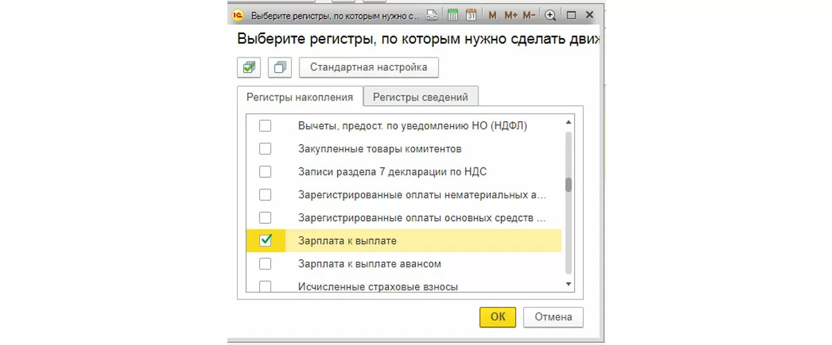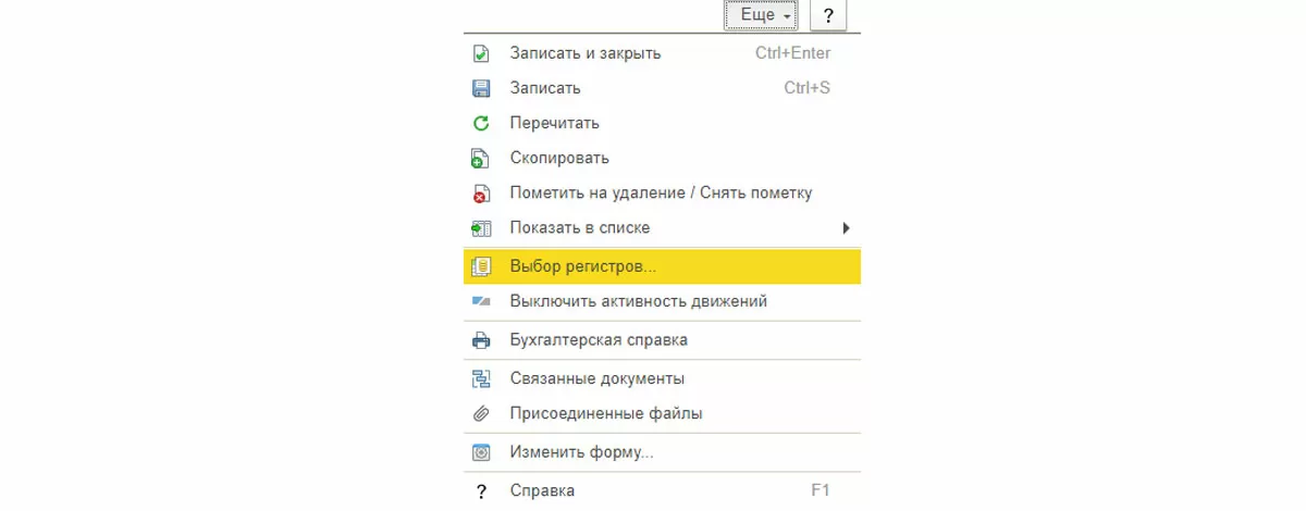 И еще, чтобы НДФЛ с материальной выгоды удерживался из зарплаты сотрудника автоматически, нужно внести корректировки в регистры. Для этого нажимаем кнопку «Еще» в только что созданной «Операции», и находим пункт «Выбор регистров».