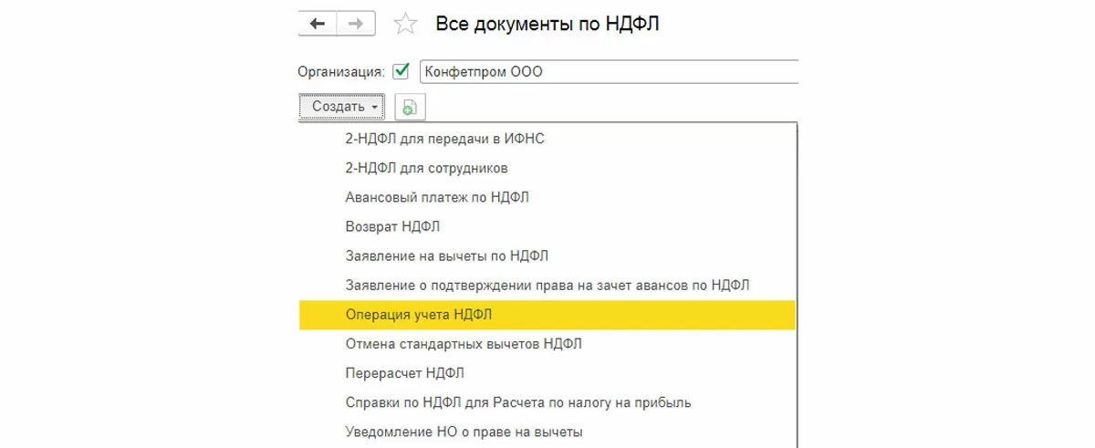 При помощи кнопки «Создать» создаем документ «Операция учета НДФЛ».