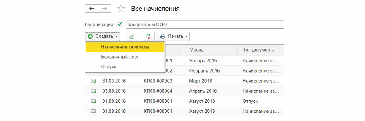 Для удержания займа и процентов по нему из заработной платы сотрудника в 1С используется документ «Начисление зарплаты». Находим его в меню «Зарплата и кадры» – «Зарплата» – «Все начисления». Попадаем в список начислений, и при помощи кнопки «Создать» создаем новое «Начисление зарплаты».
