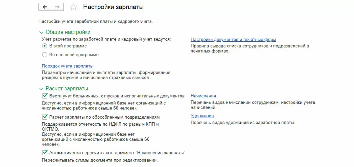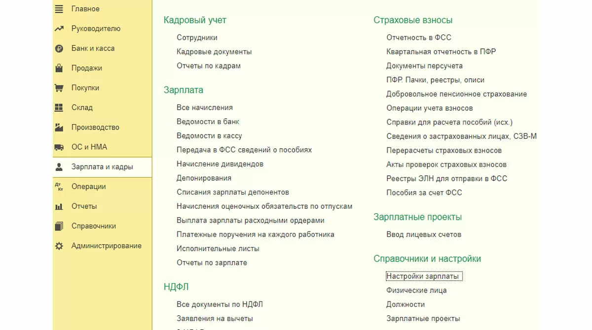 В счет погашения займа необходимо создать в программе 1С новое удержание. Для этого из главного меню заходим в пункт меню «Зарплата и кадры» – «Справочники и настройки» – «Настройки зарплаты».
