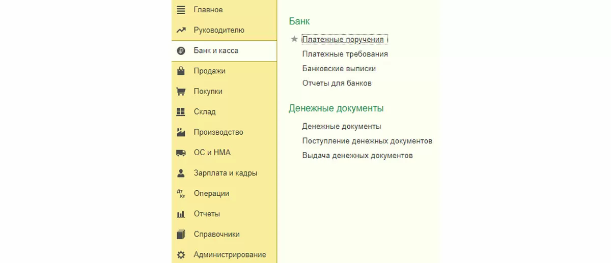 Выдача займа сотруднику в программе 1С начинается с создания платежного поручения. В главном меню выбираем «Банк и касса», далее «Банк», затем «Платежные поручения».