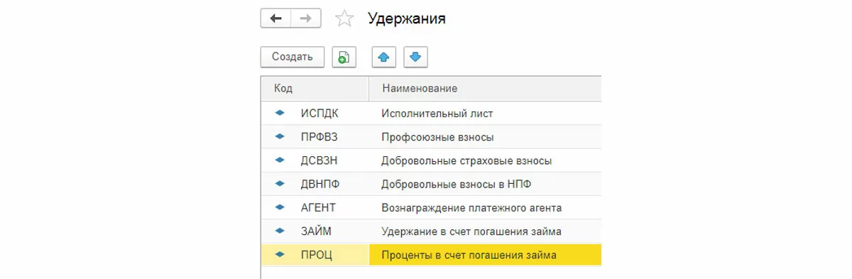 Таким же способом создаем вид «Удержания для процентов по займам». Таким образом, в списке удержаний добавились два наших новых удержания.